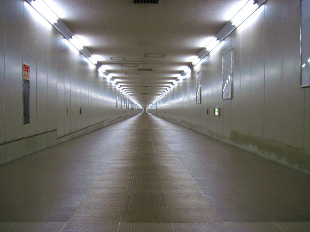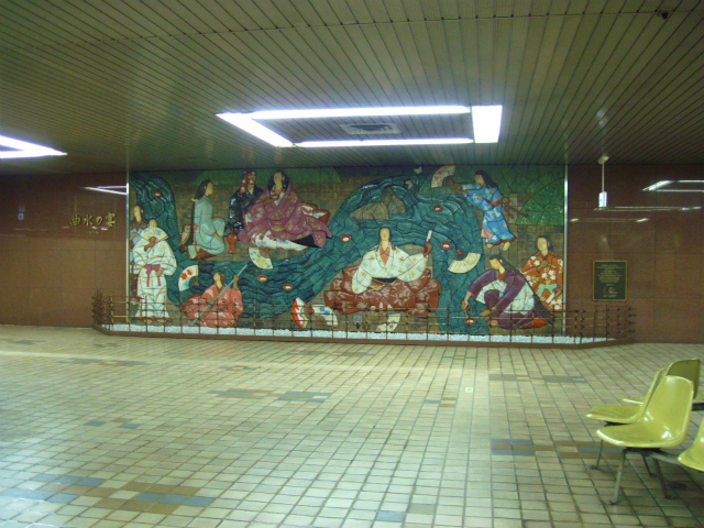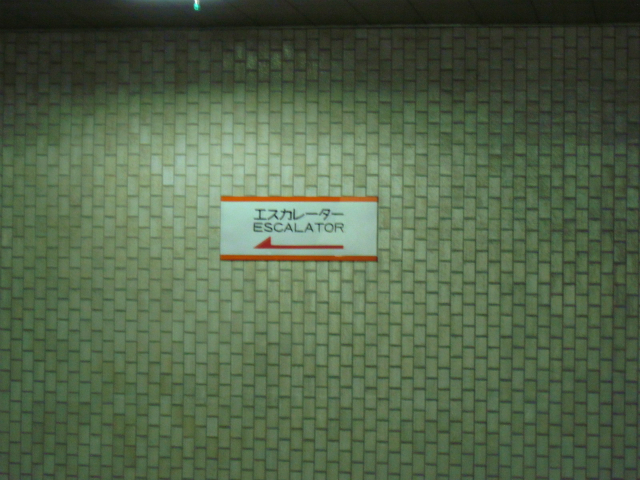 駅名票とエスカレーターの看板 閉鎖された駅構内とコンコースの壁画 連絡通路と空港第2ビル駅側の通路入口