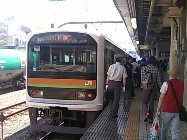 で、そんな八高線。たまたま変な顔の209系が来ました。ご存じ、お台場からの転校生、209系3100番台です(^^;)