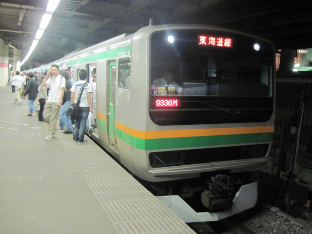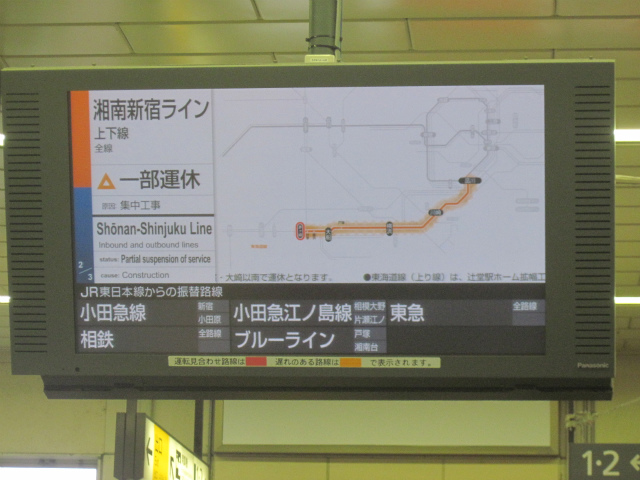 来たのはいつもの車両、231系。上りの藤沢始発は平日に2本あるけど、藤沢行は設定がないので…これまた貴重なLED表示を披露。貨物線経由と違って車内のLEDも自動放送もちゃんと対応。