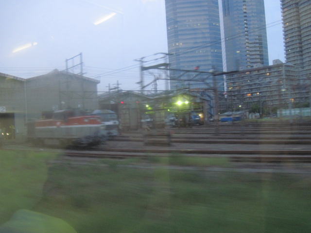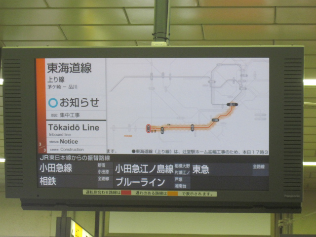 臨時ホームなので、エスカレーターなどはなし。駅員さんのお詫び放送が目立ってました。 横浜経由の電車と同着したけど、貨物線経由の電車が先に出発。新橋方の渡り線をゆっくり走っていつもの線路に合流、品川からは車内のLEDも復活しました。そんなこんなで無事に新橋に到着。