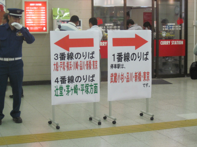 藤沢では上り始発電車と下り藤沢止まりが並ぶダイヤになっているようで、1番線/3番線/4番線に231系が3本並ぶという光景も。 改札前にはいつも以上に係員を配置して案内に当たっていました。ライナーホームへの階段には藤沢駅長の姿も…。