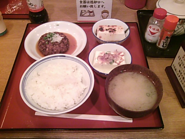 今日のお昼はとうふハンバーグと冷や奴です(^^;) 小鉢2つとメイン1つ、ご飯と味噌汁がついて700円也。