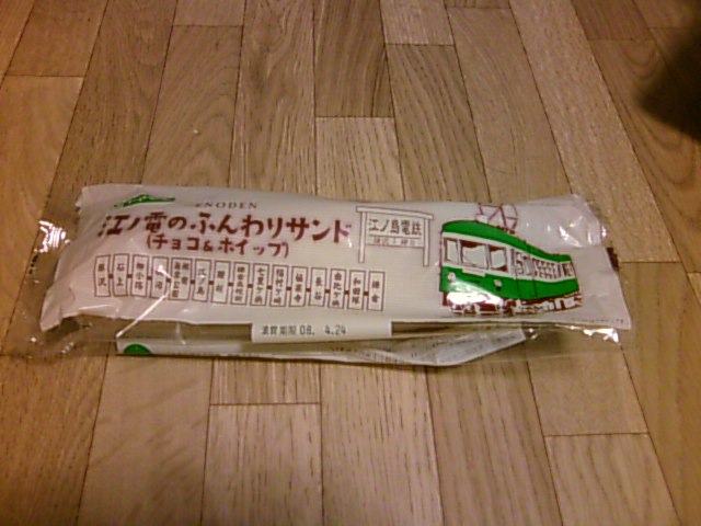 学内にあるローソンで見掛けたので買ってみた。山崎パンの"江ノ電のふんわりサンド(チョコ&ホイップ)"、130円。