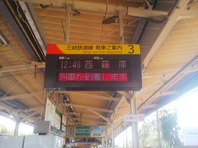 増水の影響で一部区間が代行バス。案内では西藤原行でも今日は山城~三里、明日は保々~三里がバスによる運行に。