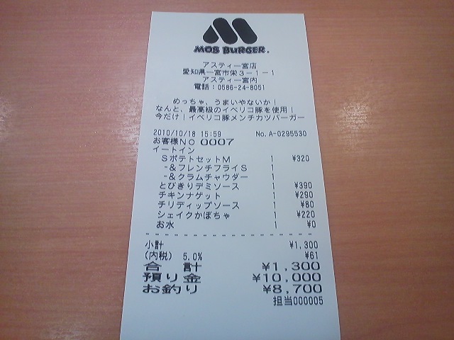 mixiにも同じ写真がありますが…ちょっと遅めのお昼は一宮のモス。お客様NO.0007と誰かが喜びそうな数字なのは置いといて…お水もレシートに記載できることに驚き。意外な新発見…(^^;)