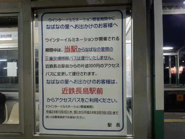 普段は桑名からバスが出てるんですがこの期間はとなりの長島からバス…日常のアクセスは桑名の方が便利でも渋滞を考えると長島の方が近いということなんでしょう。ジャズドリーム長島やらスパーランドも長島の方が近いと思うんですが…桑名は一応特急が止まりますからね。もっとも名古屋からならバスの方が楽でしょうけど(笑)