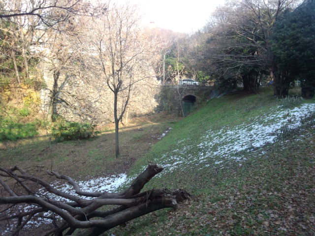場所を教えてもらったので来てみました。言われないとただのお堀にしか見えないですが、かつてはここを電車が走っていました。さらに以前は名古屋城の外堀だったわけですが…お堀の地下に電車が走ってるところは他にもありますが、お堀跡を電車が走っていたのはここだけではないでしょうか。