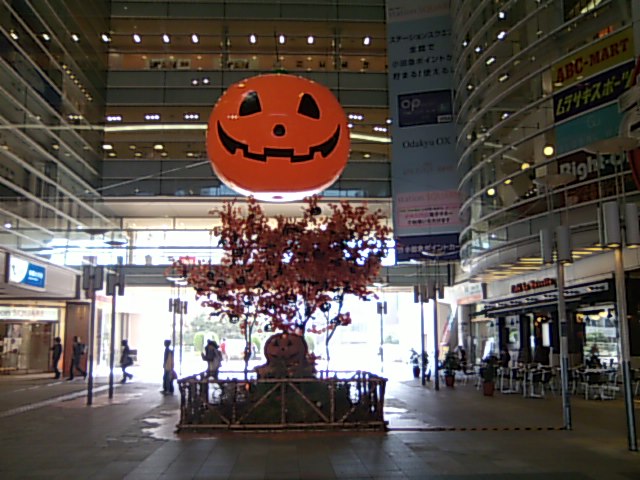相模大野駅改札前広場に秋らしいものが。巨大なカボチャ、それに紅葉。