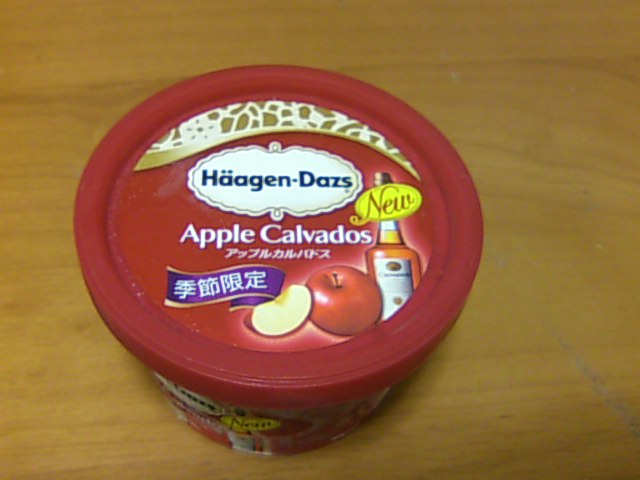 えーっと…とりあえずこのアイス、洋酒が入ってます。カルバドス自体がリンゴの蒸留酒ですからね(^^;) といってもそのものズバリお酒の味がするわけではなく、リンゴの味ですが、食べたあとの感じは普通のアイスとは違うんですよね。ただ美味しいだけではないんですよ(^^;)