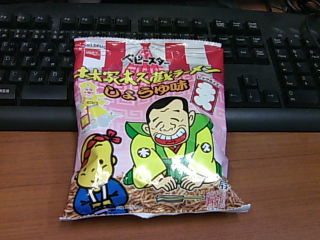 きのうポテチを食べてしばらく胃痛に悩まされましたが、面白いベビースターを見つけたので買っちゃいました。林家木久蔵ラーメンしょうゆ味。